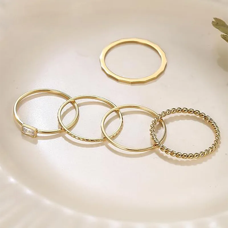 심플하게 쌓을 수 있는 여성용 반지 - 당신의 스타일을 보여주세요 - 이 골드 및 실버 반지 세트에는 다양한 스타일과 심플한 디자인의 매우 얇고 정교한 반지 5개가 포함되어 있습니다. 단독으로 착용하면 우아하고 심플한 느낌을 연출할 수 있으며, 함께 착용하면 대담한 스타일을 연출할 수 있습니다. 스태킹, 믹싱 및 매칭, 스타일링 옵션에 적합합니다!